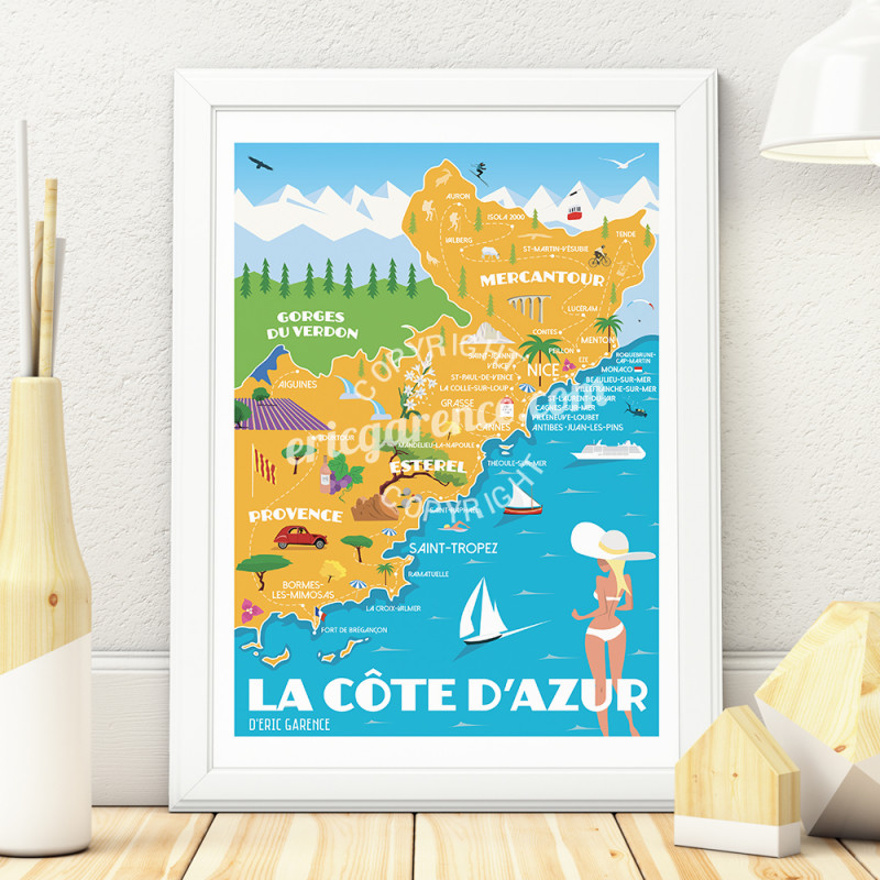 Art illustration produced on the occasion of the release of the book "La Côte d'Azur by Eric Garence" and used as a summary of the book. Available at: https://www.bonjourlaffiche.com/en/book/344-book.html