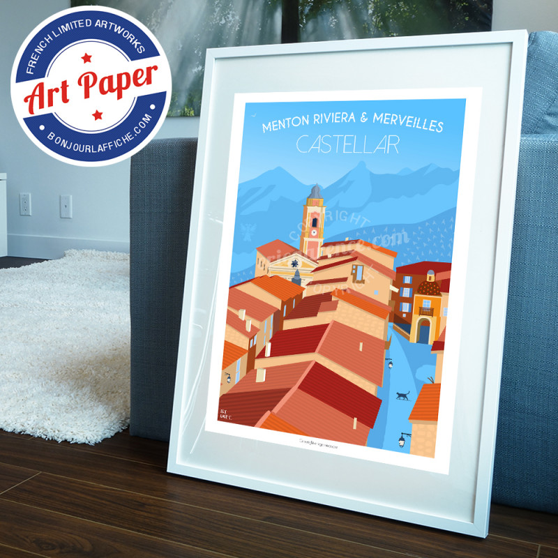 At the bend of a small tour in the mountains, you will find Castellar, a small village which will have charmed the heart of the artist Eric Garence. Nestled on its rocks, overlooking Menton and the bay of Garavan, Castellar is a small medieval town in yellow and orange tones. For the bravest, you can access Castellar by a very narrow road on which caution is required. For others, find the poster signed Eric Garence from the small village of Castellar.