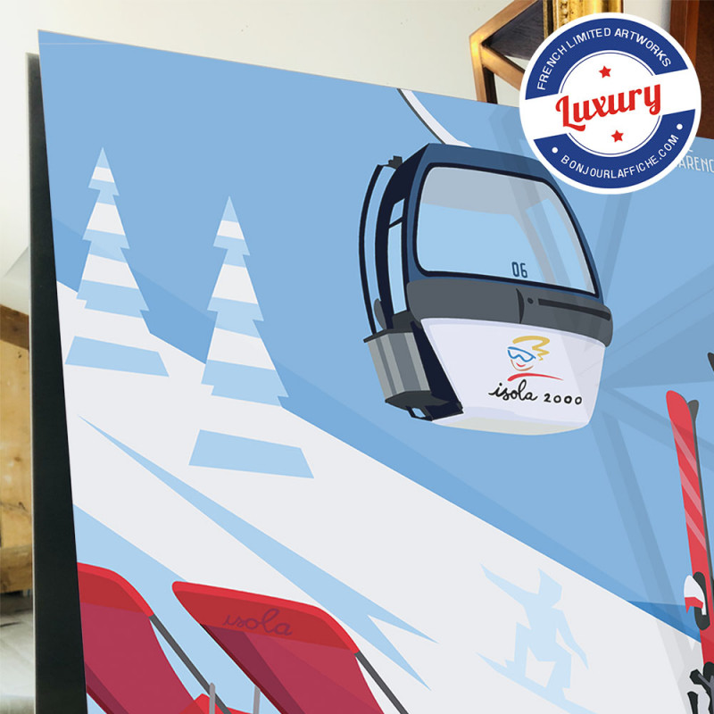 Art illustration part of the Côte d'Azur series, published in 2018 this original poster represents the station both authentic and sporty Isola 2000.
