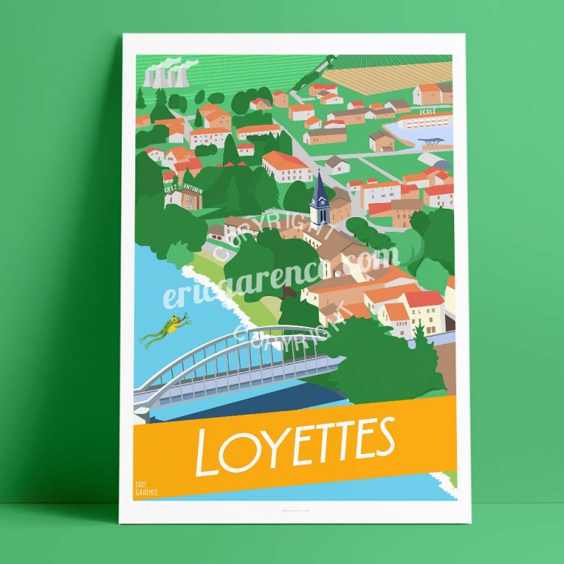 Art illustration part of the series France published in 2017, this original poster is signed Eric Garence and represents Loyettes and the banks of the Rhone. You can find the frog, national dish in this region but also its famous steeple, its institutions as the school, "Chez Antonin The Bascouk" but also in the background fields and the Bugey Nuclear Power Plant. In the foreground, the famous Pont de Loyettes, arch bridge crossing the Rhone and border between the towns of Loyettes in Ain and Saint-Romain-de-Jalionas in Isere. On a house you can see the affection of the locals for the Rhone football team Olympique Lyonnais.