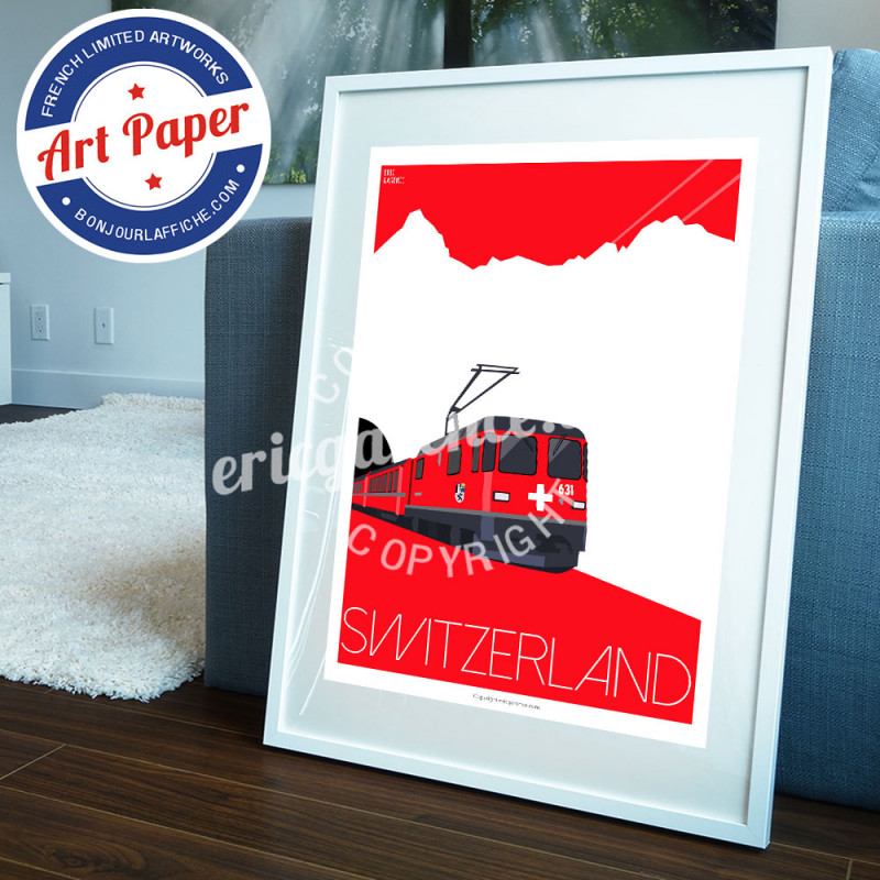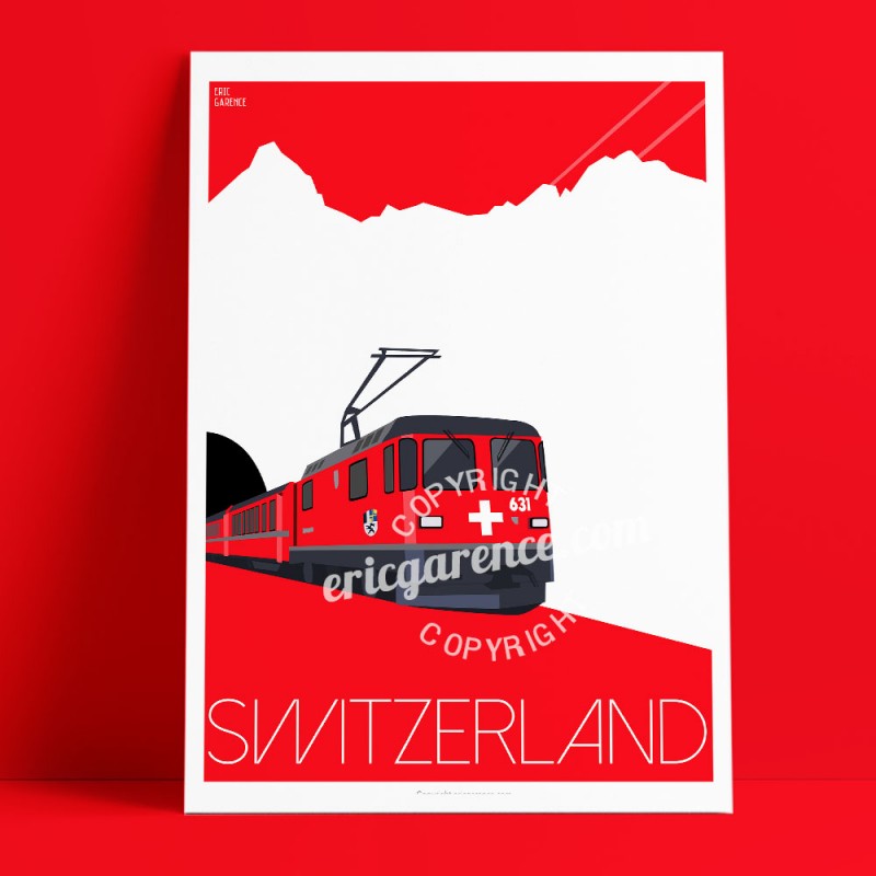 Art illustration part of the series devoted to Switzerland. Edited in 2018, this original poster signed Eric Garence is an invitation to travel through the evocation of a train crossing the Swiss Confederation.