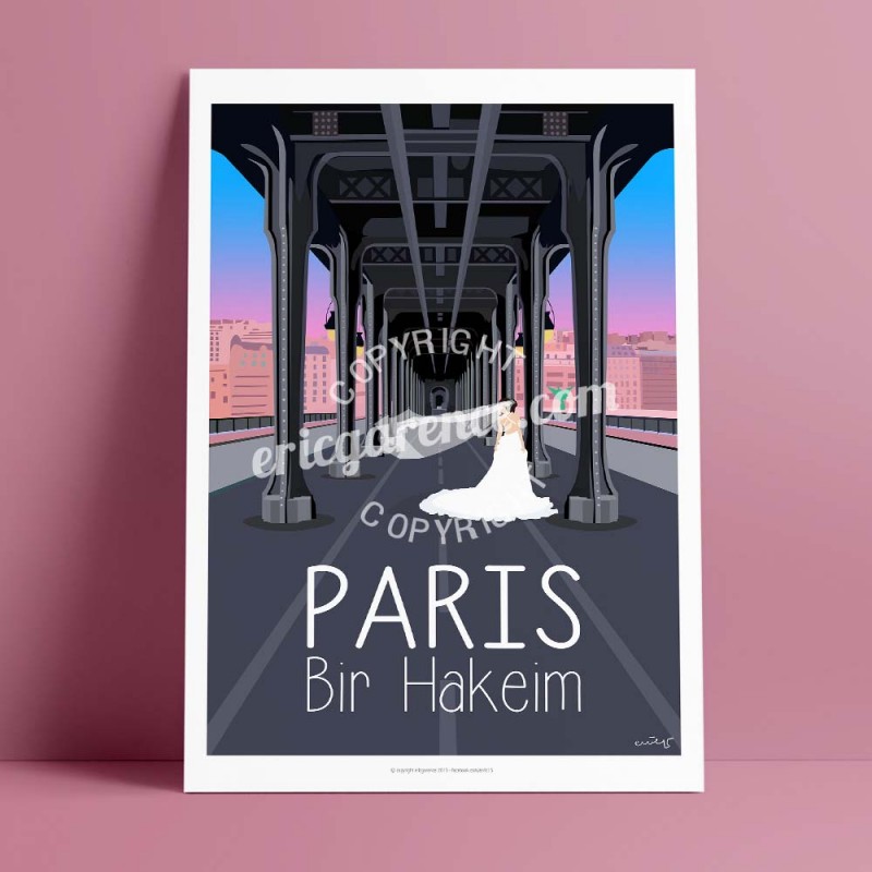 Illustration d'art faisant partie de la série Parisienne éditée en 2015, cette affiche originale est signée Eric Garence et reprend la célèbre mariée du pont de Bir Hakeim, saurez-vous retrouver le marié ?