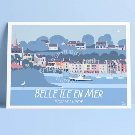 Illustration d'art faisant partie de la série consacrée à Belle-Ile-en-Mer et le Port de Sauzon de 2019, cette affiche originale signée Eric Garence.