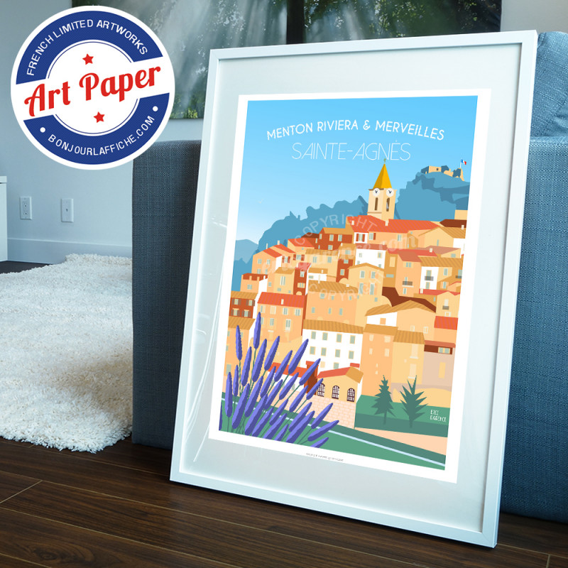 Entre mer et montagnes et bercée de lavandes sauvages, Sainte Agnes est un village au caractère authentique. A 800 mètres d’Altitude, l’artiste Eric Garence vous invite à une promenade aux abords de la petite cité. La commune vous offre un point de vu exceptionnel sur le littoral au loin et Menton en contre bas. Sur l'affiche, on y voit, Sainte Agnes parmis les montagnes et les lavandes, puis au loin, les vestiges du château-fort médiéval dominent Sainte-Agnès du haut de leurs 800 mètres. Découvrez l’affiche Neo rétro de l’artiste Eric Garence sur le village de Sainte Agnès.