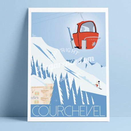 Illustration d'art faisant partie de la série Les Alpes, collection 2018, cette affiche originale signée Eric Garence présente la station de Courchevel. Avec son ancienne télécabine rouge. Sur la gauche en contrebas de la station, un palace se devine...