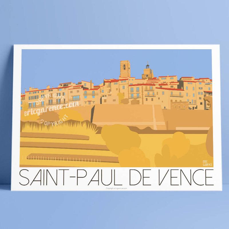 Illustration d'art faisant partie de la série de 2019 consacrée à la Côte d'Azur. Editée en 2019 cette affiche originale présente Saint Paul de Vence en été.